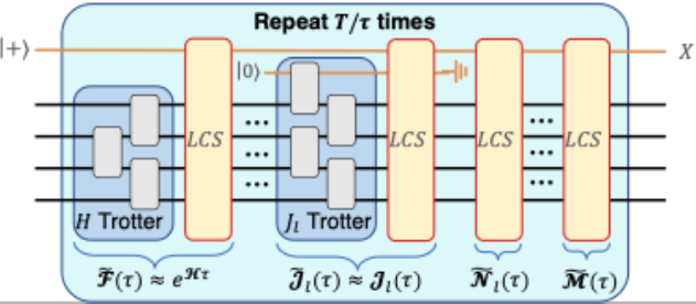 在第一步中,该方案使用粗粒度模拟来为整个模拟过程构建易实现的近似框架。方案首先将 开放系统演化拆成“哈密顿部分“和“耗散部分”,用便于实现的门操作和基于Trotter 思想的电路结构, 将模拟的主要部分以硬件友好的近似实现。这一步的特征是电路深度较浅,但是模拟精度受限。